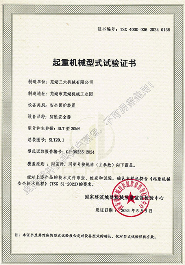 SLT型20kN防墜器型式試驗證書